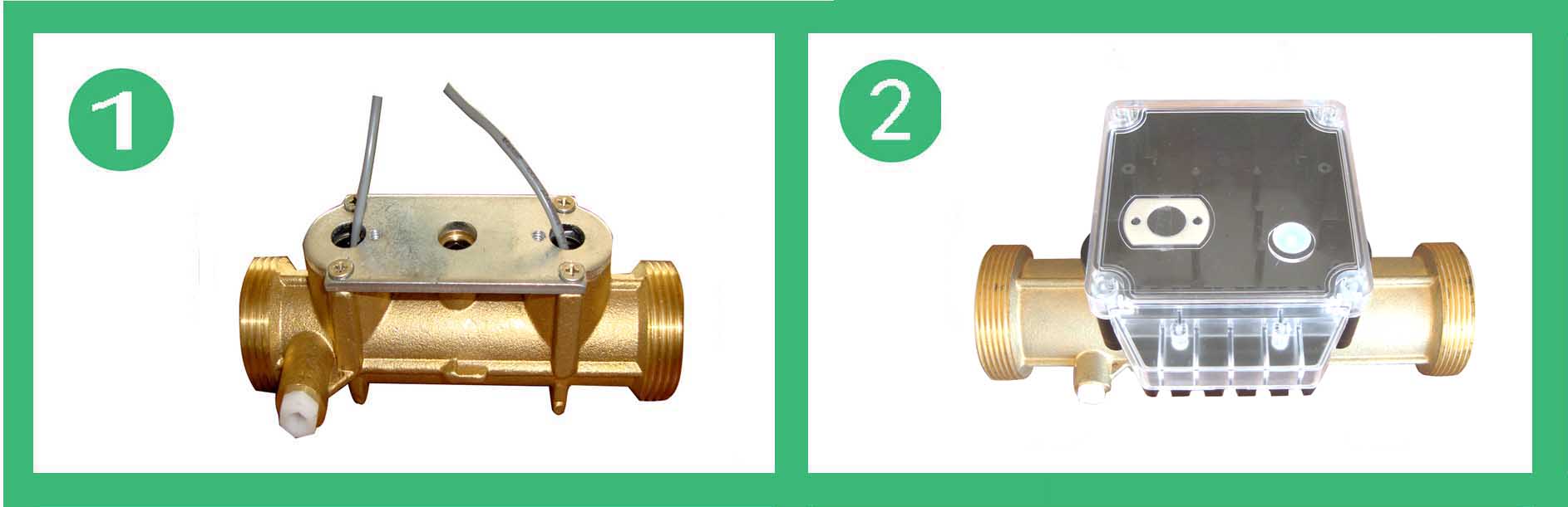 b.樓棟型熱量表超聲波流量計(jì)由表殼、換能器、換能器座組成。順流方向和逆流方向,換能器1或換能器2發(fā)射的超聲波信號由換能器2或換能器1接收。