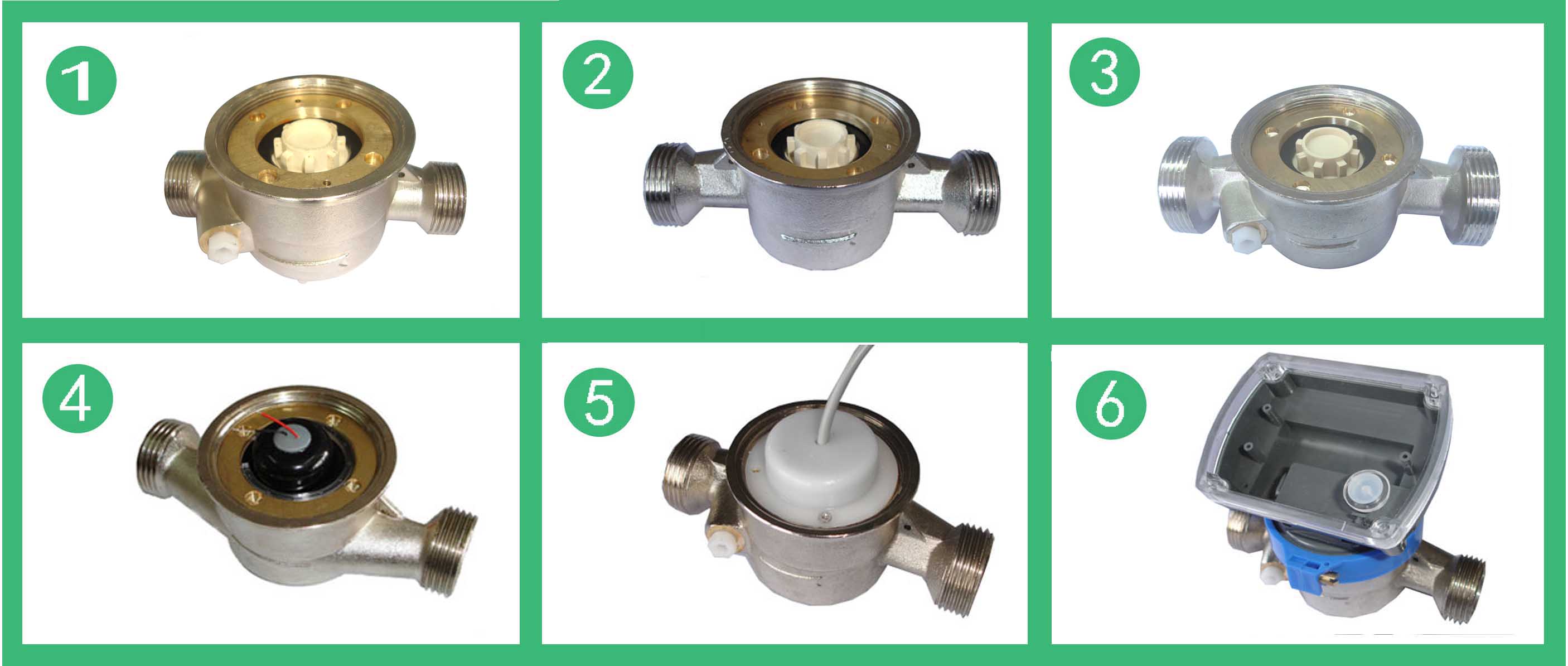 單流束有磁熱量表流量計(jì)的結(jié)構(gòu)如圖,其工作原理是:熱水進(jìn)入流量計(jì),經(jīng)進(jìn)水導(dǎo)向孔沖擊計(jì)量腔內(nèi)的葉輪旋轉(zhuǎn),再經(jīng)出水導(dǎo)向孔流出流量計(jì)。葉輪上面嵌有磁鋼隨葉輪旋轉(zhuǎn),在隔板上端的韋根遠(yuǎn)傳組件,接受葉輪旋轉(zhuǎn)的周期信號(hào)。單流束有磁熱量表流量計(jì)的殼體采用優(yōu)質(zhì)黃銅,經(jīng)金屬模鑄造、數(shù)控機(jī)床和組合機(jī)床加工,機(jī)械強(qiáng)度好、尺寸精度穩(wěn)定一致,塑料零件選用進(jìn)口的高強(qiáng)度耐熱工程塑料,密封件采用優(yōu)質(zhì)耐熱材料。因此,該流量計(jì)完全能夠適應(yīng)國(guó)內(nèi)供熱系統(tǒng)的惡劣工作環(huán)境。